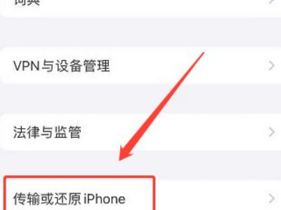 在通用界面上,点击“传输或还原iPhone”。 3 点击下方的还原