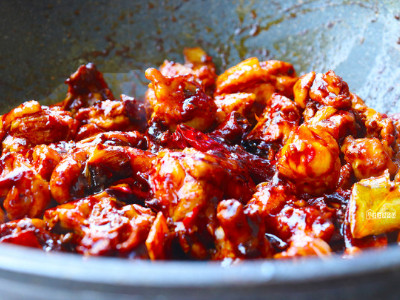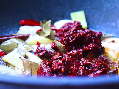 热锅烧油,放葱、姜、蒜、干辣椒、花椒、麻椒、香叶、八角、桂皮、豆瓣酱、火锅底料翻炒出香味。 2 炒咸鸡放入调料