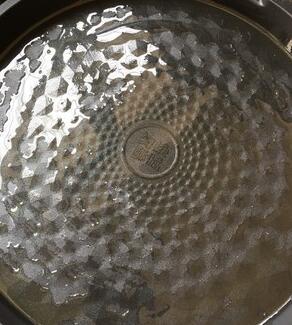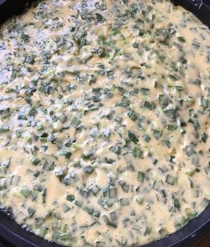 到入韭菜面糊,用铲子摊平,盖上加热。