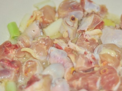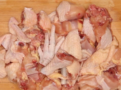 葱切段,姜切片,鸡洗净剁小块,干香菇泡发。 2 煸炒